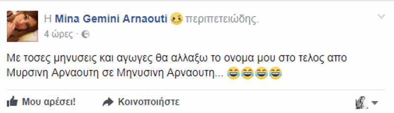 Σήμερα η Μίνα Αρναούτη ανέβασε στα social media το εξής: «Με τόσες μηνυσεις και αγωγές θα αλλάξω το όνομά μου στο τέλος από Μυρσίνη Αρναούτη σε Μηνυσίνη Αρναούτη…».
