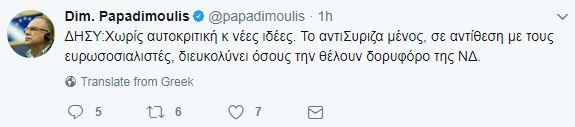«ΔΗΣΥ: Χωρίς αυτοκριτική και νέες ιδέες», αναφέρει ο ευρωβουλευτής του ΣΥΡΙΖΑ και αντιπρόεδρος του Ευρωπαϊκού Κοινοβουλίου, Δημήτρης Παπαδημούλης, με ανάρτησή του στο twitter.