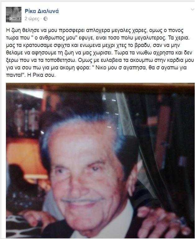 «Η ζωή θέλησε να μου προσφέρει απλόχερα μεγάλες χάρες, όμως ο πόνος τώρα που “ο άνθρωπος μου” έφυγε, είναι τόσο πολύ μεγαλύτερος. Τα χέρια μας τα κρατούσαμε σφιχτά και ενωμένα μέχρι χθες το βράδυ, σαν να μην θέλαμε να αφήσουμε τη ζωή να μας χωρίσει. Τώρα τα νιώθω άχρηστα και δεν ξέρω που να τα τοποθετήσω. Όμως με ευλάβεια τα ακουμπώ στην καρδιά μου για να σου πω για μια ακόμη φορά: “Νίκο μου σ΄αγάπησα, θα σ’αγαπώ για πάντα!”. Η Ρίκα σου» έγραψε χαρακτηριστικά η ηθοποιός, αναρτώντας μία φωτογραφία του συζύγου της.