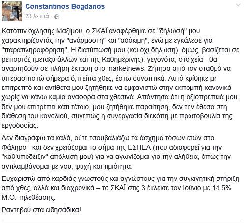 Τη δική του εκδοχή για τους λόγους της απομάκρυνσής του από τον τηλεοπτικό σταθμό ΣΚΑΪ έδωσε με ανάρτηση στον προσωπικό του λογαριασμό στο Facebook, ο Κωνσταντίνος Μπογδάνος.