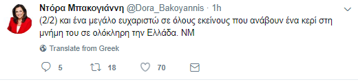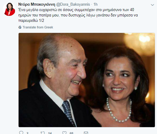 Μέσα από ανάρτησή της στο Twitter η Ντόρα Μπακογιάννη ευχαρίστησε όλους όσοι παραβρέθηκαν στο μνημόσυνο για την συμπλήρωση 40 ημερών από τον θάνατο του πατέρα της Κωνσταντίνου Μητσοτάκη.