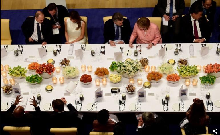 Δίπλα από την κυρία Τραμπ και τον Πούτιν καθόταν η καγκελάριος Μέρκελ παρέα με τον πρόεδρο της Αργεντινής Μαουρίτσιο Μάρτσι, ενώ ο Αμερικανός Πρόεδρος καθόταν στην απέναντι πλευρά του τεράστιου τραπεζιού, δίπλα από τη σύζυγο του Προέδρου της Αργεντινής, Τζουλιάνα Αουάντα.