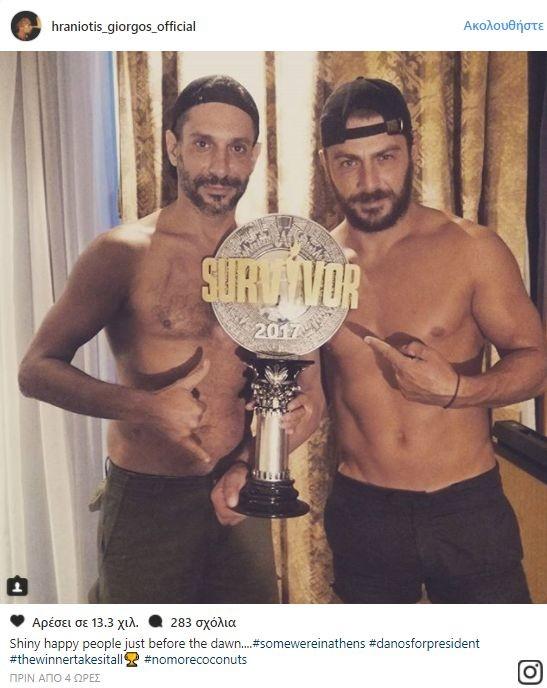 Ο Γιώργος Αγγελόπουλος αυτή την στιγμή βρίσκεται στο ξενοδοχείο που του έχει κλείσει η παραγωγή για να μείνει μέχρι να επιστρέψει στην Σκιάθο. Εκεί τον επισκέφθηκε ο Γιώργος Χρανιώτης με τον οποίο έβγαλαν μία φωτογραφία αγκαλιασμένοι, να κρατούν το έπαθλο…χωρίς μπλούζες!