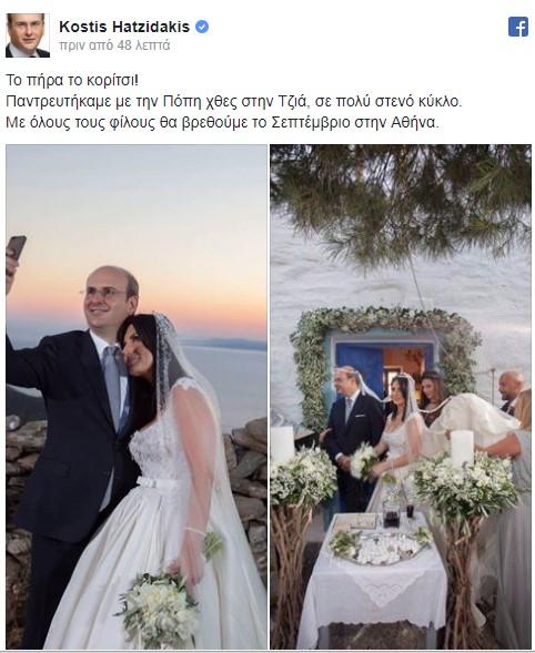 Ο αντιπρόεδρος της Νέας Δημοκρατίας, Κωστής Χατζηδάκης, παντρεύτηκε με θρησκευτικό γάμο τη γιατρό του Ασκληπιείου Βούλας και πρώην πολιτευτή της παράταξης, Πόπη Καλαϊτζή, σε πολύ στενό κύκλο στην Τζιά.