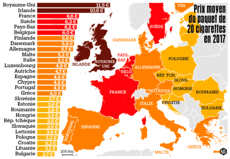 Σύμφωνα με το γράφημα της Liberation, πιο φθηνά είναι τα τσιγάρα στη γειτονική μας Βουλγαρία με το πακέτο να κοστίζει μόλις 2,7 ευρώ.