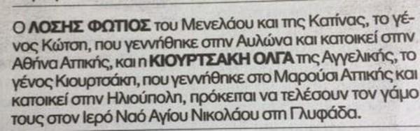 «Ο Λόσης Φώτης του Μενελάου και της Κατίνας, το γένος Κώτση, που γεννήθηκε στην Αθήνα Αττικής και η Κιουρτσάκη Όλγα της Αγγελικής, το γένος Κιουρτσάκη, που γεννήθηε στο Μαρούσι Αττικής και κατοικεί στην Ηλιούπολη, πρόκειται να τελέσουν τον γάμο τους στον Ιερό Ναό Αγίου Νικολάου στη Γλυφάδα».