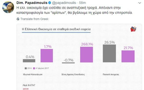 Η ελληνική οικονομία έχει εισέλθει σε αναπτυξιακή τροχιά και η κυβέρνηση θα βγάλει τη χώρα από την επιτροπεία, αναφέρει ο αντιπρόεδρος του Ευρωπαϊκού Κοινοβουλίου και επικεφαλής της ευρωομάδας του ΣΥΡΙΖΑ, Δημήτρης Παπαδημούλης, με ανάρτησή του στο twitter, επικαλούμενος στοιχεία της ΕΛΣΤΑΤ.