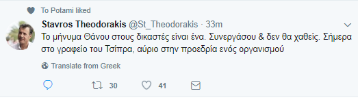 «Το μήνυμα Θάνου στους δικαστές είναι ένα. Συνεργάσου & δεν θα χαθείς. Σήμερα στο γραφείο του Τσίπρα, αύριο στην προεδρία ενός οργανισμού» αναφέρει το καυστικό σχόλιο του Σταύρου Θεοδωράκη για την κίνηση αυτή, ανεβάζοντας το πολιτικό «θερμόμετρο» για τα όσα εκτυλίσσονται τους τελευταίους μήνες στον χώρο της Δικαιοσύνης.