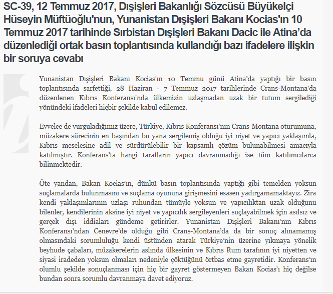 «Οι παρατηρήσεις του Έλληνα υπουργού Εξωτερικών, κ. Κοτζιά, κατά τη διάρκεια της συνέντευξης Τύπου στην Αθήνα, στις 10 Ιουλίου, σχετικά με το ότι η Τουρκία επέδειξε μία μη συμβιβαστική στάση κατά τη διάρκεια της Διάσκεψης για την Κύπρο που πραγματοποιήθηκε στο Κρανς Μοντανά μεταξύ 28 Ιουνίου – 7 Ιουλίου 2017, είναι εντελώς απαράδεκτες.