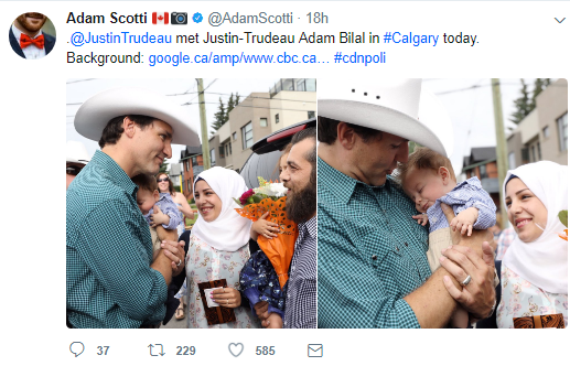 Οι γονείς του μωρού ονόμασαν τον γιο τους προς τιμήν του Καναδού Πρωθυπουργού και η πρώτη τους συνάντηση έγινε σε φεστιβάλ στο Κάλγκαρι το Σάββατο. Το δύο μηνών αγοράκι κοιμόταν γαλήνια στην αγκαλιά του πρωθυπουργού του Καναδά προσφέροντας ένα πολύ γλυκό στιγμιότυπο.
