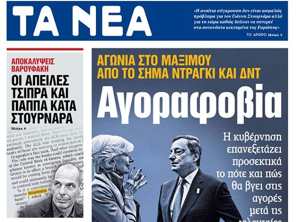 «Μόλις γίνω πρωθυπουργός, θα ζητήσω την παραίτησή του. Κι αν χρειαστεί θα τον διώξω από την κεντρική τράπεζα με φωνές και κλωτσιές», διαβεβαίωσε ο Αλέξης Τσίπρας σύμφωνα με το απόσπασμα από το βιβλίο του Γιάνη Βαρουφάκη. Και τότε σύμφωνα πάντα με τα όσα αναφέρει στο βιβλίο του ο πρώην υπουργός Οικονομικών, ο Νίκος Παππάς εξήγησε ότι «υπάρχουν και πιο δραστικές λύσεις στο πρόβλημα»- πιο δραστικές από τις φωνές και τις κλωτσιές. Φυσικά ο Στουρνάρας έμεινε στη θέση του ακόμη κι όταν η σύζυγος του υπέση τις πιο δραστικές μεθόδους του Παππά, αναφέρουν τα ΝΕΑ.