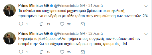 Όπως αναφέρει ο πρωθυπουργός σε αναρτήσεις του στο Twitter, «το σύνολο του επιχειρησιακού μηχανισμού βρίσκεται σε επιφυλακή, προκειμένου να συνδράμει με κάθε τρόπο στην αντιμετώπιση των συνεπειών».