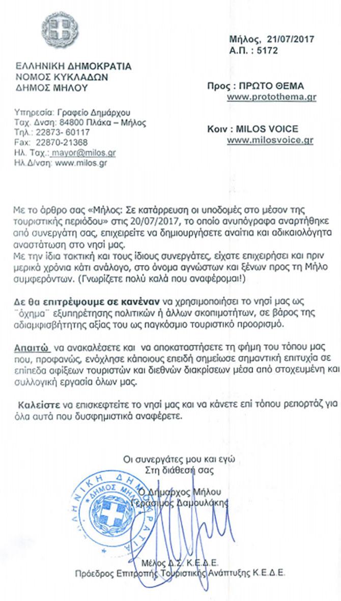 Η Περιφέρεια Νοτίου Αιγαίου μάλιστα, προ ολίγων ημερών, επέβαλε πρόστιμο 42.000 ευρώ στον Δήμο Μήλου για παράνομη απόρριψη λυμάτων που υποβαθμίζουν το περιβάλλον (δείτε τη σχετική απόφαση). Αντί όμως ο δήμαρχος Μήλου κ. Δαμουλάκης να απαντήσει στα πραγματικά μεγάλα και ντροπιαστικά για το νησί και τον τουρισμό, που τώρα που είναι στην κορύφωση του, προβλήματα, έστειλε μια προσβλητική, επιθετική και απειλητική επιστολή στο «Πρώτο Θέμα» για το ρεπορτάζ που δημοσίευσε (διαβάστε την παρακάτω και αυτήν).