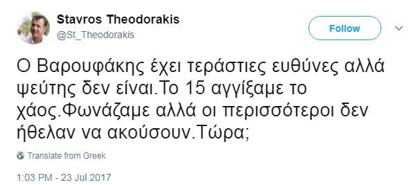 Μέσω Twitter σχολίασε ο Σταύρος Θεοδωράκης τις αποκαλύψεις του πρώην τσάρου της ελληνικής οικονομίας, Γιάνη Βαρουφάκη, μέσα από το νέο του βιβλίο «Adults in the Room».