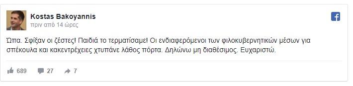 “Ώπα. Σφίξαν οι ζέστες! Παιδιά το τερματίσαμε! Οι ενδιαφερόμενοι των φιλοκυβερνητικών μέσων για σπέκουλα και κακεντρέχειες χτυπάνε λάθος πόρτα. Δηλώνω μη διαθέσιμος. Ευχαριστώ.”