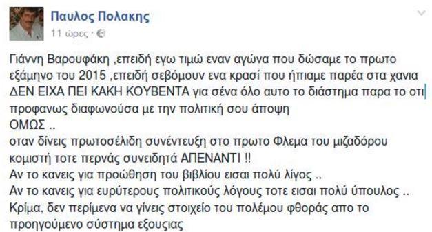 «Γιάννη Βαρουφάκη, επειδή εγω τιμώ εναν αγώνα που δώσαμε το πρωτο εξάμηνο του 2015 ,επειδή σεβόμουν ενα κρασί που ήπιαμε παρέα στα χανια ΔΕΝ ΕΙΧΑ ΠΕΙ ΚΑΚΗ ΚΟΥΒΕΝΤΑ για σένα όλο αυτο το διάστημα παρα το οτι προφανως διαφωνούσα με την πολιτική σου άποψη