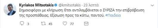 «Σημαιοφόροι με κλήρωση: Έτσι αντιλαμβάνεται ο ΣΥΡΙΖΑ την επιβράβευση της προσπάθειας. Εξίσωση προς τα κάτω, παντού. #Παιδεία», έγραψε στο λογαριασμό του ο πρόεδρος της ΝΔ.