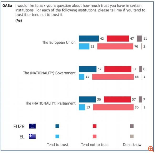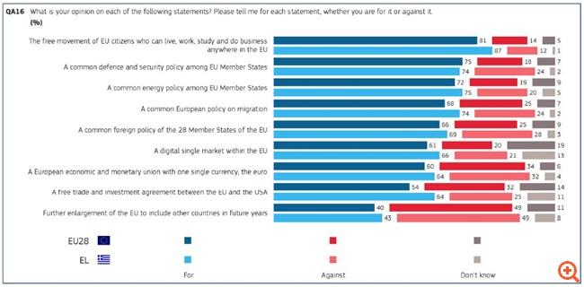 Στο ερώτημα «τί εικόνα έχετε για την Ε.Ε.;», «αρνητική» απαντά το 47% των Ελλήνων και το 21% των ευρωπαίων, «ουδέτερη» απαντά το 34% των Ελλήνων και το 37% των ευρωπαίων και «θετική» απαντά το 18% των Ελλήνων και το 40% των ευρωπαίων.