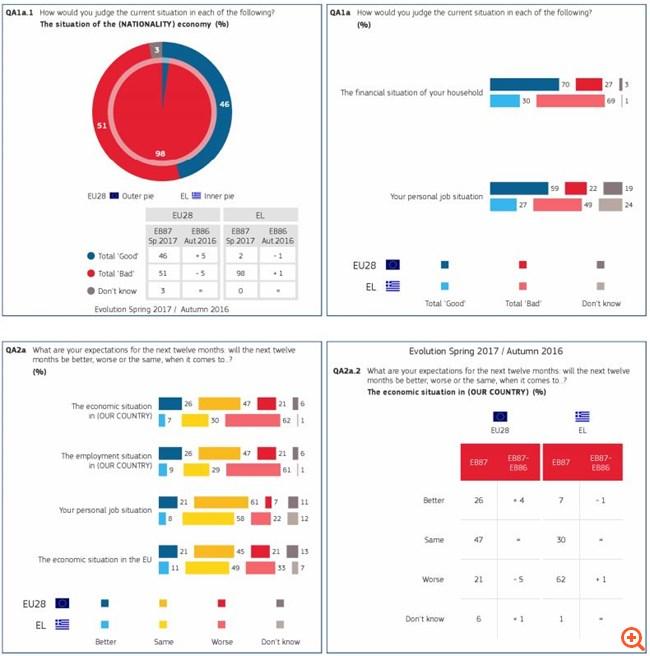 Συγκεκριμένα, το 98% των Ελλήνων πολιτών θεωρούν ότι η τρέχουσα κατάσταση της εθνικής οικονομίας είναι «κακή», έναντι 51% των Ευρωπαίων πολιτών. Μόνο το 2% των Ελλήνων ερωτηθέντων απάντησαν ότι η κατάσταση της εθνικής οικονομίας είναι «καλή», έναντι 46% των Ευρωπαίων πολιτών.