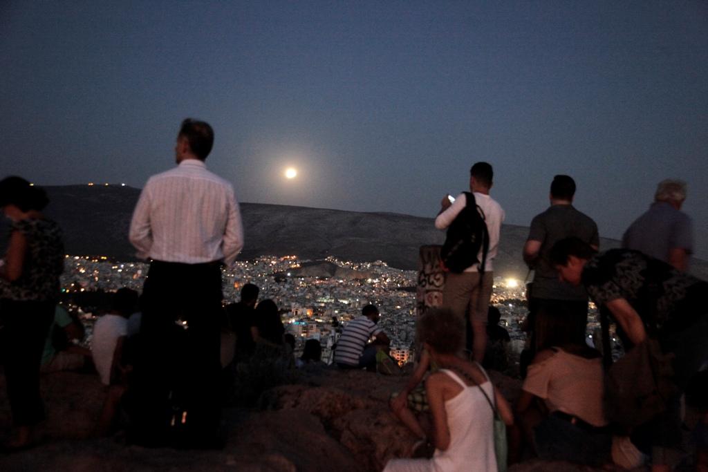 Αρκετοί παρατηρητές της αυγουστιάτικης πανσελήνου συγκεντρώθηκαν σε μπαλκόνια, ταράτσες, μουσεία και αρχαιολογικούς χώρους της Αθήνας για να θαυμάσουν το ρομαντικό θέαμα.