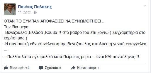 Την κατάκτηση του χρυσού μεταλλίου της Κατερίνας Στεφανίδη στο Παγκόσμιο Πρωτάθλημα του Λονδίνου, την απομάκρυνση της Γενικής Εισαγγελέως στη Βενεζουέλα και τη σημερινή πανσέληνο σχολίασε ο αναπληρωτής υπουργός Υγείας, Παύλος Πολάκης, σε ανάρτησή του στο Facebook.
