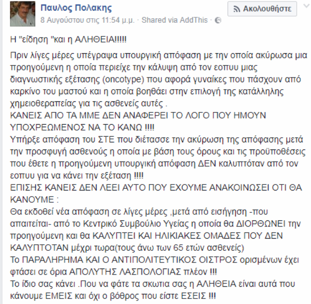 Με μια ανάρτησή του στο facebook ο αναπληρωτής Υπουργός Υγείας, Παύλος Πολάκης απάντησε στο θέμα που έχει προκύψει σχετικά με την εξέταση που δεν καλύπτεται από τον ΕΟΠΥΥ για τη θεραπεία γυναικών που πάσχουν από καρκίνο του μαστού. Συγκεκριμένα, επισήμανε ότι ο ίδιος εφάρμοσε την απόφαση του ΣτΕ και ενημερώνει ότι το ζήτημα θα λυθεί μέσα στις επόμενες ημέρες.