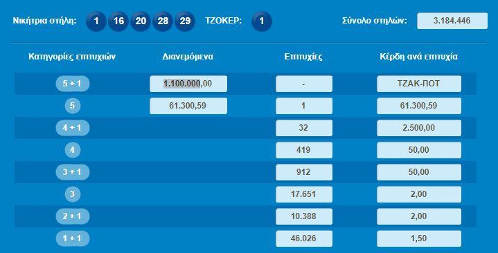 Οι τυχεροί αριθμοί είναι οι: 1, 16, 20, 28, 29