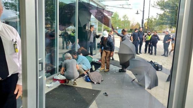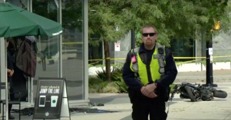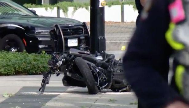 Η μοτοσικλέτα εκτοξεύτηκε και έπεσε πάνω στη τζαμαρία του πύργου Shaw Tower, σύμφωνα με αυτόπτες μάρτυρες.