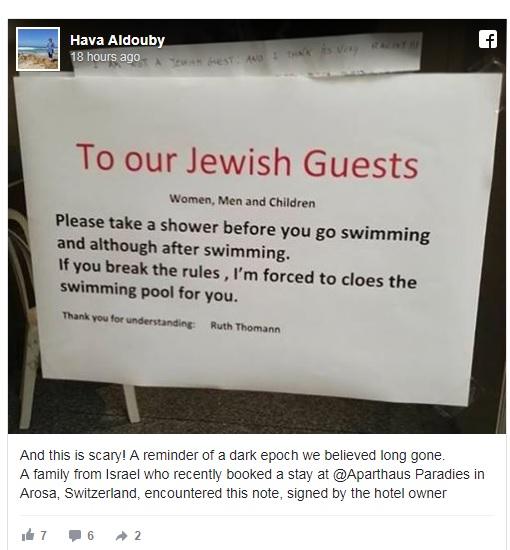 Μια ρατσιστική πινακίδα ενός ξενοδοχείο στην Ελβετία έχει προκαλέσει σάλο, καθώς ζητά από τους Εβραίους πελάτες να κάνουν μπάνιο πριν χρησιμοποιήσουν την πισίνα των εγκαταστάσεων.