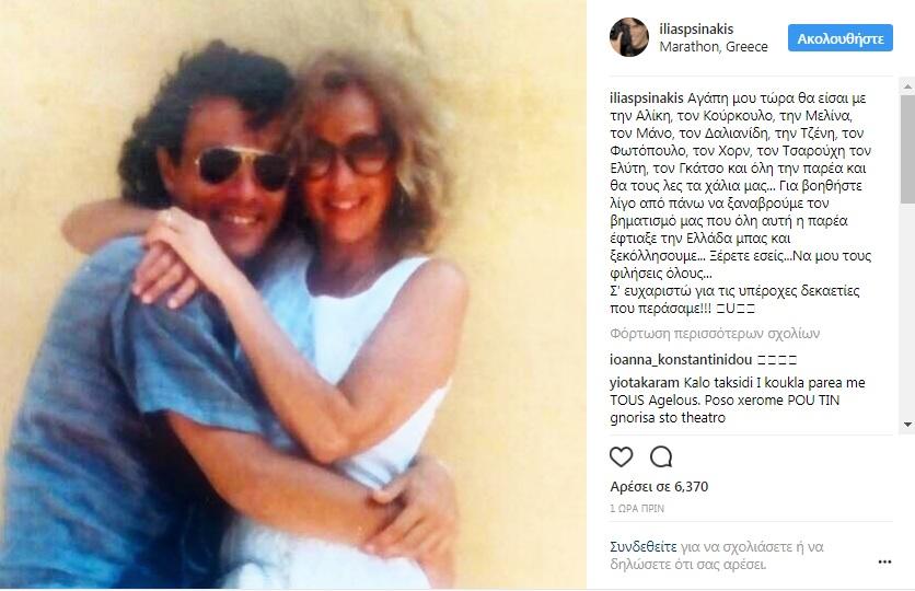«Αγάπη μου τώρα θα είσαι με την Αλίκη, τον Κούρκουλο, την Μελίνα, τον Μάνο, τον Δαλιανίδη, την Τζένη, τον Φωτόπουλο, τον Χορν, τον Τσαρούχη τον Ελύτη, τον Γκάτσο και όλη την παρέα και θα τους λες τα χάλια μας… Για βοηθήστε λίγο από πάνω να ξαναβρούμε τον βηματισμό μας που όλη αυτή η παρέα έφτιαξε την Ελλάδα μπας και ξεκόλλησουμε… Ξέρετε εσείς…Να μου τους φιλήσεις όλους… Σ’ ευχαριστώ για τις υπέροχες δεκαετίες που περάσαμε!!»
