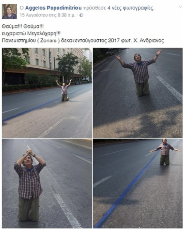 Ο λόγος για τον Άγγελο Παπαδημητρίου, ο οποίος εντυπωσιασμένος από το γεγονός ότι το κέντρο της Αθήνας ήταν άδειο έκανε λόγο για θαύμα και στις φωτογραφίες που ανέβασε στον προσωπικό του λογαριασμό στο facebook έκανε λόγο για θαύμα.