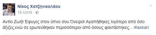 «Αντίο Ζωή! Έφυγες στον ύπνο σου.Όνειρο! Αγαπήθηκες λιγότερο από όσο άξιζες,ενώ σε ερωτεύθηκαν περισσότεροι από όσους φαντάστηκες… #laskari», έγραψε χαρακτηριστικά.
