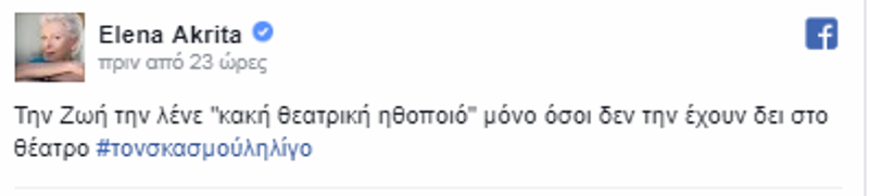 Η Έλενα Ακρίτα γράφει για τη Ζωή Λάσκαρη: «Την Ζωή την λένε «κακή θεατρική ηθοποιό» μόνο όσοι δεν την έχουν δει στον θέατρο #τονσκασμούληλίγο». Αυτό, βέβαια, πυροδότησε μια νέα σειρά σχολίων κάτω από την ανάρτηση…