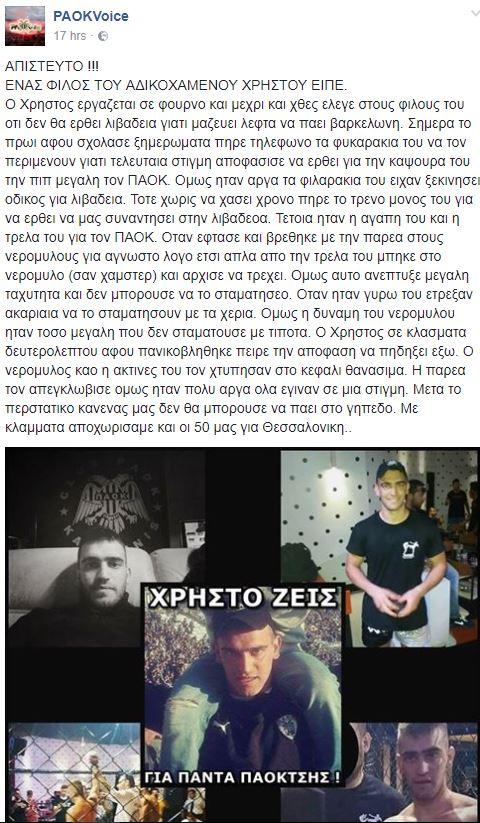 Ένας φίλος του αδικοχαμένου οπαδού του ΠΑΟΚ περιέγραψε συγκλονιστικό τρόπο τον τρόπο που έφυγε από τη ζωή στη Λιβαδειά ο 24χρονος Χρήστος Μπακόλας.
