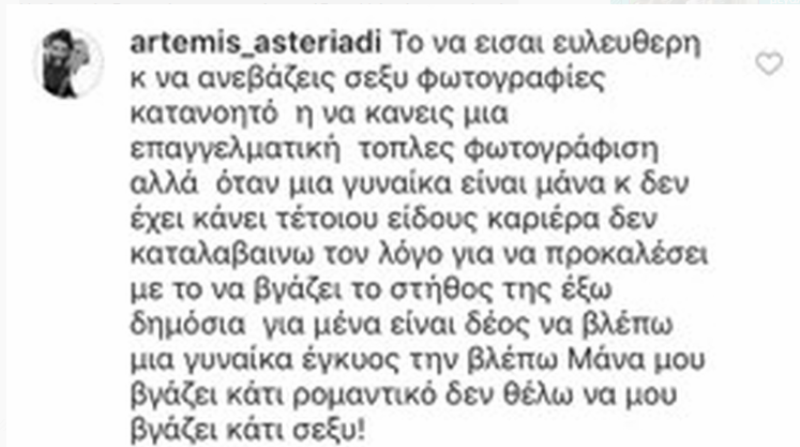 Η Αγγελική δέχθηκε κάποια αρνητικά και ανάμεσα σ’ αυτούς που σχολίασαν ήταν και η Άρτεμις Αστεριάδη, η οποία έγραψε: “Το να είσαι ελεύθερη και να ανεβάζεις σέξι φωτογραφίες κατανοητό ή να κάνεις μια επαγγελματική topless φωτογράφηση, αλλά όταν μια γυναίκα είναι μάνα και δεν έχει κάνει τέτοιου είδους καριέρα, δεν καταλαβαίνω τον λόγο για να προκαλέσει με το να βγάζει το στήθος της έξω δημόσια. Για εμένα είναι δέος να βλέπω μια γυναίκα έγκυο. Τη βλέπω σαν μάνα, μου βγάζει κάτι ρομαντικό δεν θέλω να μου βγάζει κάτι σέξι”.
