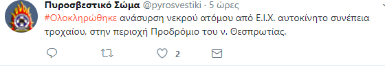 Έρευνες για τα ακριβή αίτια του δυστυχήματος διενεργεί το Τμήμα Τροχαίας Παραμυθιάς.