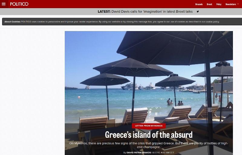 «Η Μύκονος μπορεί να είναι ελληνικό νησί αλλά δεν είναι Ελλάδα», ισχυρίζεται σε σημερινό της αφιέρωμα η ιστοσελίδα politico, μέσα από τη ματιά αρθογράφου της David Patrikarakos που επισκέφθηκε το νησί των ανέμων.