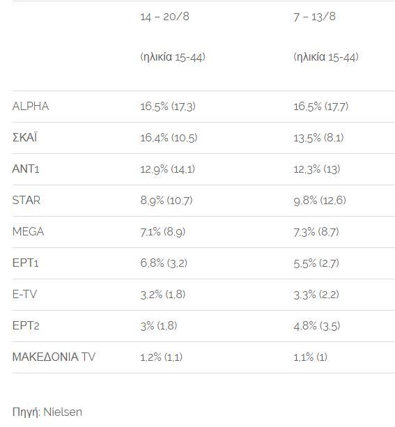 Σχεδόν την ίδια τηλεθέαση κατέγραψαν την περασμένη εβδομάδα ο Alpha και ο ΣΚΑΪ, με τον σταθμό του Κοντομηνά να προηγείται ελαφριά στο σύνολο του κοινού και αρκετά στο νεανικό κοινό.
