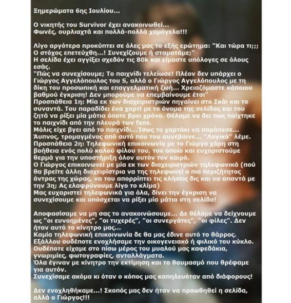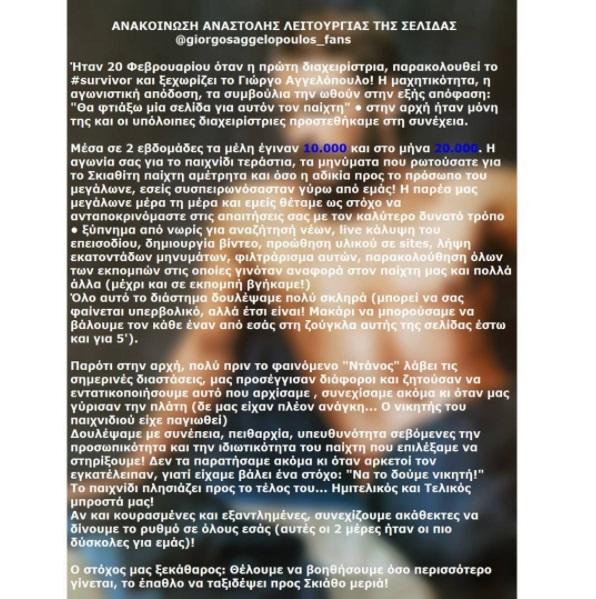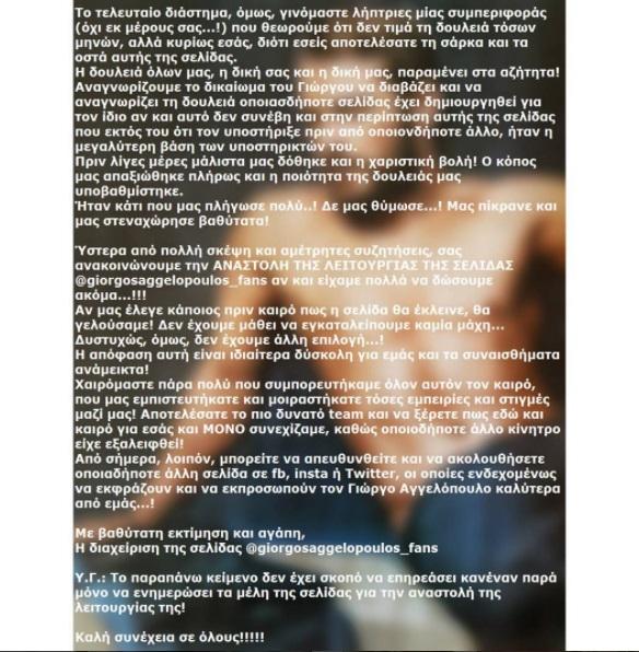 Ο κόπος μας απαξιώθηκε πλήρως και η ποιότητα της δουλειάς μας υποβαθμίστηκε. Ήταν κάτι που μας πλήγωσε πολύ..! Δε μας θύμωσε…! Μας πίκρανε και μας στεναχώρησε βαθύτατα! Από σήμερα, λοιπόν, μπορείτε να απευθυνθείτε και να ακολουθήσετε οποιαδήποτε άλλη σελίδα σε fb, insta ή Twitter, οι οποίες ενδεχομένως να εκφράζουν και να εκπροσωπούν το Γιώργο Αγγελόπουλο καλύτερα από εμάς…!