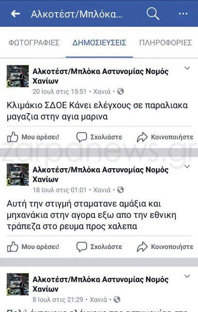 Φυσικά και το δαιμόνιο μυαλό των δημιουργών της σελίδας δεν έμεινε μόνο στους ελέγχους της Αστυνομίας. Όπως φαίνεται και στη φωτογραφία του zarpanews.gr, το «ραπόρτο» δίνεται και για τους ελέγχους που κάνει το ΣΔΟΕ στις τουριστικές περιοχές.