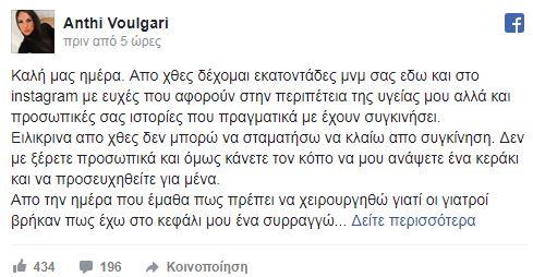 Η Ανθή, σήμερα μέσα από την προσωπική της σελίδα στο Facebook, θέλησε να μοιραστεί με τον κόσμο όλη αυτή την κατάσταση που βιώνει μετά την διάγνωση των γιατρών. Όταν της βρήκαν έναν καλοήθη όγκο στο κεφάλι!