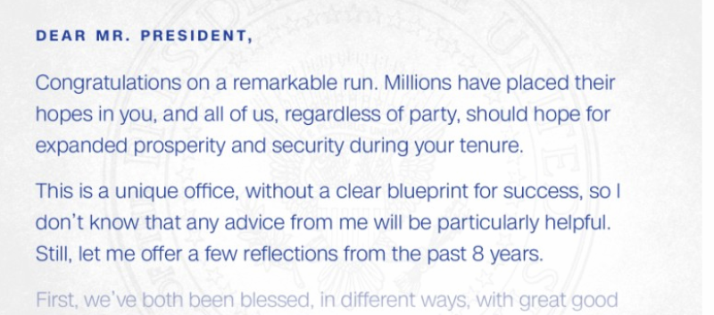 Λίγο πριν αποχωρήσει από τον Λευκό Οίκο, ο Μπαράκ Ομπάμα έγραψε μια επιστολή στον διάδοχό του, Ντόναλντ Τραμπ, με τον φάκελο να γράφει απ’ έξω: “Προς Κύριο Πρόεδρο”.