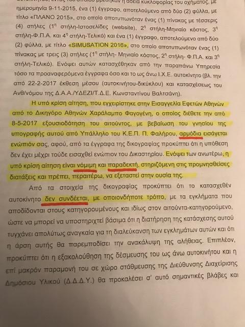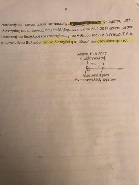 Δράττομαι της ευκαιρίας, να ενημερώσω και τους συναδέλφους του δικαστικού ρεπορτάζ, ότι αντιθέτως είναι ΤΕΛΕΣΙΔΙΚΗ και ΟΜΟΦΩΝΗ η ΑΠΟΦΑΣΗ – μετά από πρόταση της κ. Κρίνα – του συμβουλίου εφετών να μου ΑΠΟΔΟθΕΙ το αυτοκίνητο, που ΚΑΤΕΣΧΕΣΑΝ ΠΑΡΑΝΟΜΑ – όπως λέει η απόφαση –