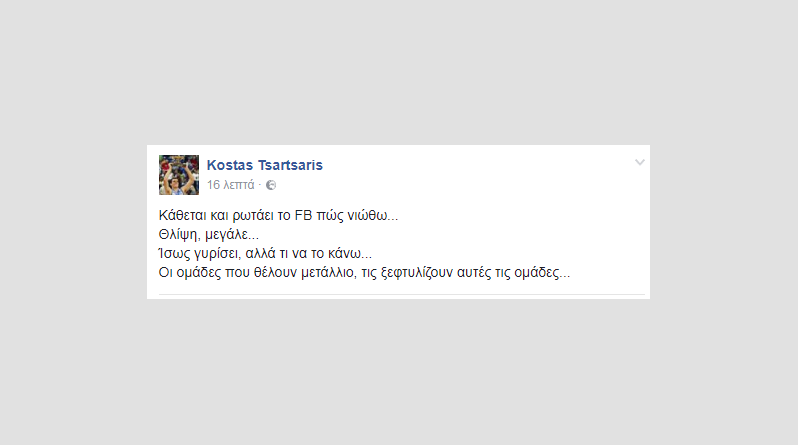 «Κάθεται και ρωτάει το facebook πως νιώθω… Θλίψη μεγάλε… Ίσως γυρίσει, αλλά τι να το κάνω… Οι ομάδες που θέλουν μετάλλιο, τις ξεφτιλίζουν αυτές τις ομάδες», σχολίασε ο πάλαι ποτέ διεθνής, που κατέκτησε με την «γαλανόλευκη» το χρυσό μετάλλιο στο Eurobasket του 2005 και το ασημένιο στο Mundobasket το 2006.