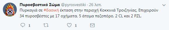 Σε εξέλιξη βρίσκεται μεγάλη πυρκαγιά σε δασική έκταση στην περιοχή Κοκκινιά Τροιζηνίας.