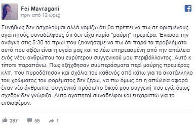 «Συνήθως δεν ασχολούμαι αλλά νομίζω ότι θα πρέπει να πω σε ορισμένους αγαπητούς συναδέλφους ότι δεν είχα καμία “μαύρη” πρεμιέρα. Ένιωσα την ανάγκη στις 5:30 το πρωί που ξεκινήσαμε να πω ότι παρά τα προβλήματα αυτό που αξίζει είναι η υγεία μας και το λέω επηρεασμένη από την απώλεια ενός νέου ανθρώπου του ευρύτερου συγγενικού μου περιβάλλοντος. Αυτό κ τίποτε παραπάνω. Πως εξήχθησαν συμπεράσματα περί μαύρης πρεμιέρας κλπ, που πυροδότησαν και σχόλια του καθενός από κάτω για το ακατάλληλο του χρώματος του φορέματος δεν ξέρω, να πω όμως ότι η απώλεια αφορά έναν νέο άνθρωπο, συγγενικό πρόσωπο δικού μου συγγενή που εγώ όμως σχεδόν δεν γνώριζα. Αυτό αγαπητοί συνάδελφοι και ευχαριστώ για το ενδιαφέρον».