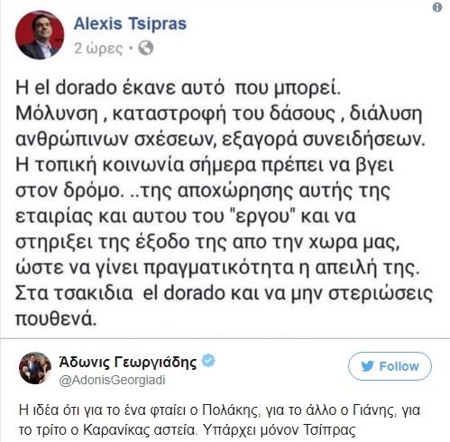 Συγκεκριμένα, ο κ. Γεωργιάδης ανέβασε στο Twitter φωτογραφία του κειμένου της ανάρτησης, στην οποία φαινόταν να την έχει κάνει ο κ. Τσίπρας, γράφοντας, παράλληλα: «Η ιδέα ότι για το ένα φταίει ο Πολάκης, για το άλλο ο Γιάνης, για το τρίτο ο Καρανίκας αστεία. Υπάρχει μόνον Τσίπρας».