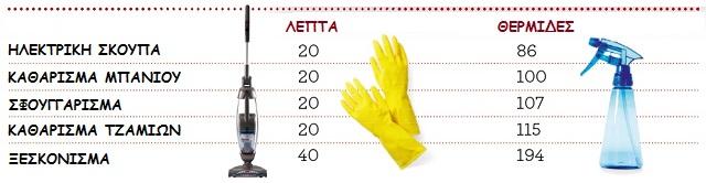 Σύμφωνα με έρευνα που πραγματοποίησε το βρετανικό Good Housekeeping Institute με τη βοήθεια εθελοντών, οι οποίοι φορούσαν συσκευή καταγραφής δραστηριότητας (activity tracker) ενώ έκαναν διάφορες δουλειές στο σπίτι, με το ξεσκόνισμα, το σκούπισμα, το σφουγγάρισμα και το καθάρισμα του μπάνιου και των τζαμιών να κάψετε σε δύο ώρες 602 θερμίδες, ενώ με το τρέξιμο για 5 ολόκληρα χιλιόμετρα οι καύσεις φτάνουν μόλις τις 374 θερμίδες.