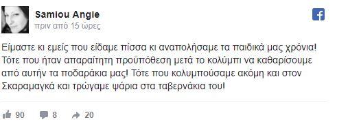 «Είμαστε κι εμείς που είδαμε πίσσα κι αναπολήσαμε τα παιδικά μας χρόνια! Τότε που ήταν απαραίτητη προϋπόθεση μετά το κολύμπι να καθαρίσουμε από αυτήν τα ποδαράκια μας! Τότε που κολυμπούσαμε ακόμη και στον Σκαραμαγκά και τρώγαμε ψάρια στα ταβερνάκια του!».