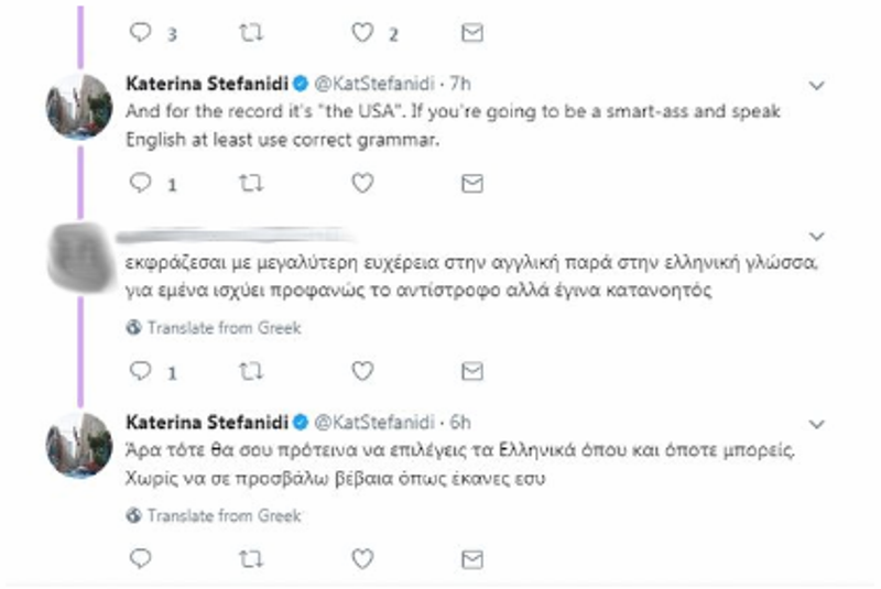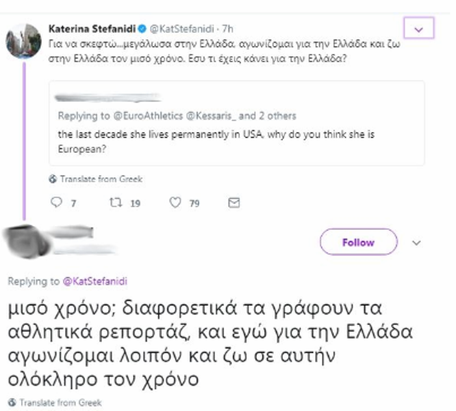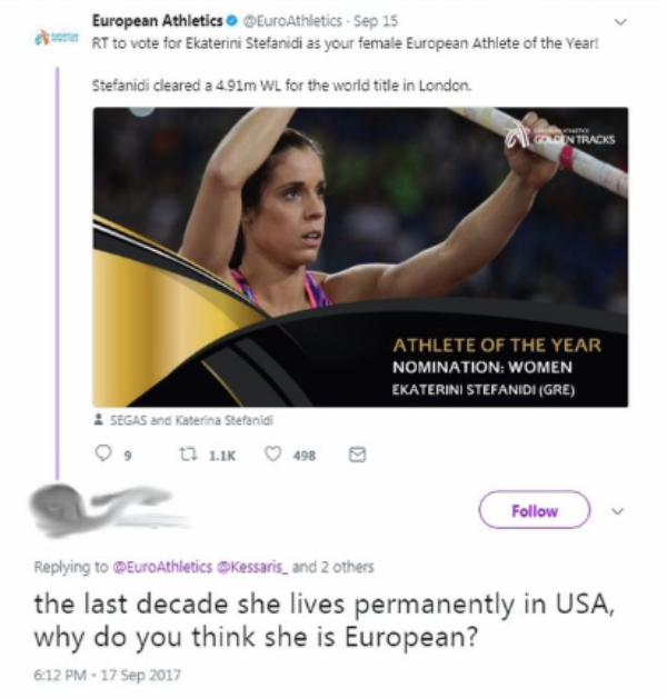 Διαδικτυακή επίθεση μέσω Twitter εξαπέλυσε ένας Έλληνας χρήστης προς την Ελληνίδα πρωταθλήτρια σχετικά με το αν πρέπει να θεωρείται Αμερικανίδα ή Ευρωπαία!